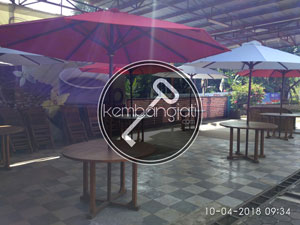 | Keterangan | 3 set meja rotan sintetis dan payung stainless |